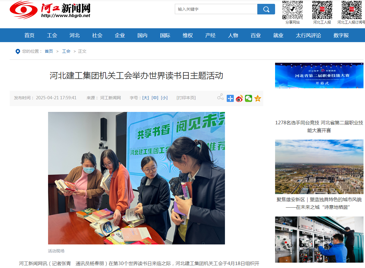 河北建工集團(tuán)機(jī)關(guān)工會(huì)舉辦世界讀書(shū)日主題活動(dòng) ?? 在第30個(gè)世界讀書(shū)日來(lái)臨之際,河北建工集團(tuán)機(jī)關(guān)工會(huì)于4月18日組織開(kāi)展“共享書(shū)香,閱見(jiàn)未來(lái)”主題活動(dòng),通過(guò)好書(shū)共享、好書(shū)推薦等環(huán)節(jié),營(yíng)造書(shū)香氛圍,激發(fā)職工閱讀興趣,吸引眾多職工積極參與...