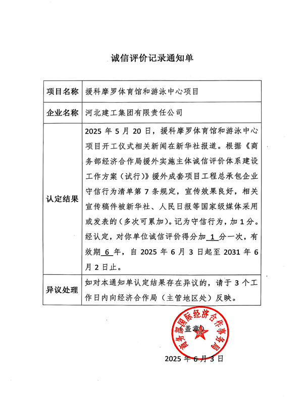 河北建工集團喜獲商務部誠信評價嘉獎 近日,河北建工集團收到商務部國際經(jīng)濟合作事務局《誠信評價記錄通知單》。集團公司因援科摩羅體育館和游泳中心項目開工儀式宣傳效果良好,宣傳稿件被新華社、人民日報等國家級媒體采用或發(fā)表的守信行為,喜獲誠信評...