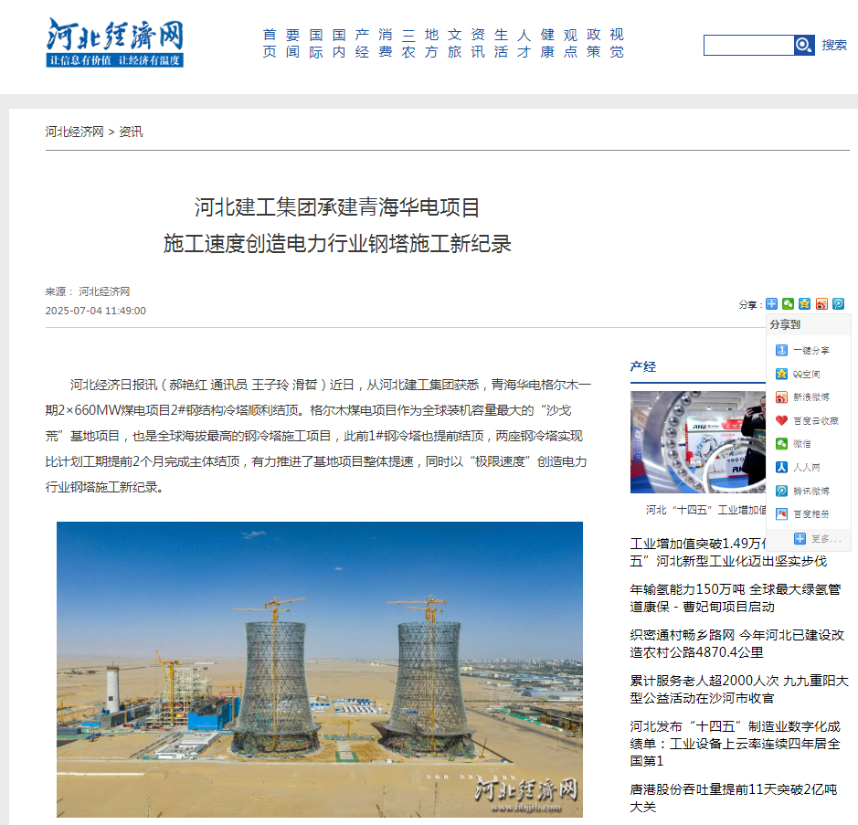 河北建工集團(tuán)承建青海華電項(xiàng)目施工速度創(chuàng)造電力行業(yè)鋼塔施工新紀(jì)錄 來源: 河北經(jīng)濟(jì)網(wǎng) 2025-07-04 11:49:00 分享: 河北經(jīng)濟(jì)日報(bào)訊(郝艷紅 通訊員 王子玲 滑哲)近日,從河北建工集團(tuán)獲悉,青海華電格爾木一...