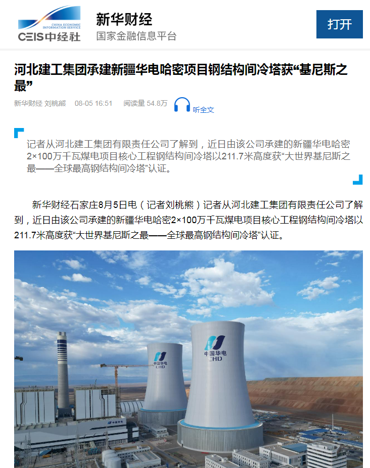 打開 河北建工集團(tuán)承建新疆華電哈密項(xiàng)目鋼結(jié)構(gòu)間冷塔獲“基尼斯之最” 新華財(cái)經(jīng)?劉桃熊? 08-05 16:51?? 閱讀量 54.8萬 ?聽全文 ? 記者從河北建工集團(tuán)有限責(zé)任公司了解到,近日由該公司承建的新疆華電...