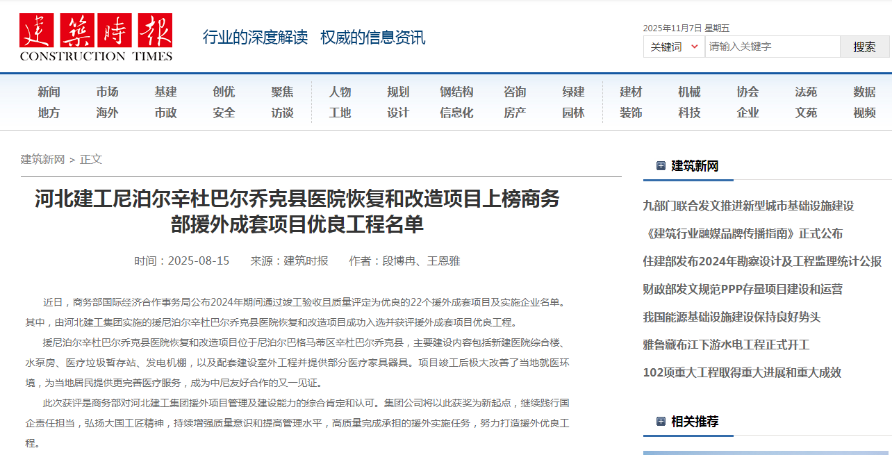 河北建工尼泊爾辛杜巴爾喬克縣醫(yī)院恢復(fù)和改造項(xiàng)目上榜商務(wù)部援外成套項(xiàng)目優(yōu)良工程名單 時間:2025-08-15來源:建筑時報(bào)作者:段博冉、王恩雅 ? ? ? 近日,商務(wù)部國際經(jīng)濟(jì)合作事務(wù)局公布2024年期間通過竣工驗(yàn)收且質(zhì)量評定為優(yōu)良的2...