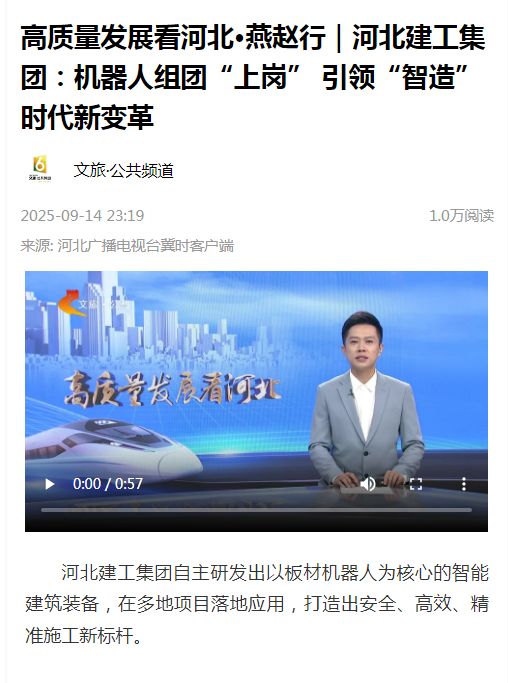 高質(zhì)量發(fā)展看河北·燕趙行|河北建工集團(tuán):機(jī)器人組團(tuán)“上崗” 引領(lǐng)“智造”時代新變革 文旅·公共頻道 2025-09-14 23:19 1.0萬閱讀 來源: 河北廣播電視臺冀時客戶端 河北建工集團(tuán)自主研發(fā)出以板材機(jī)器人為核心的智...